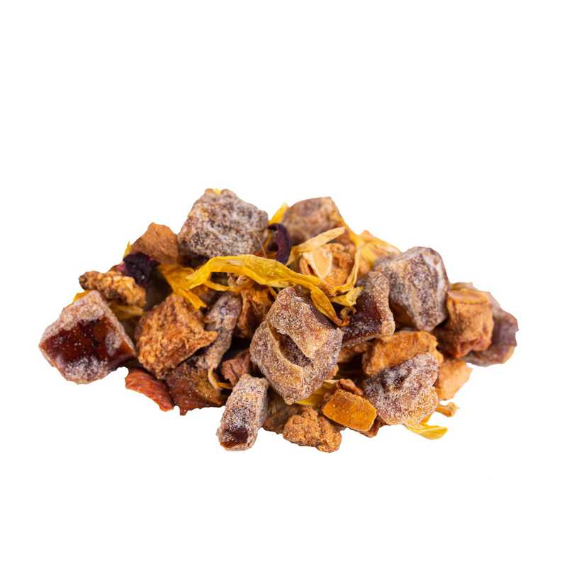 Ingrediënten: Dadels (dadels, rijstmeel), appel (21%), kaneelstokjes, kweepeer, natuurlijk aroma, hibiscus, goudsbloemblaadjes.