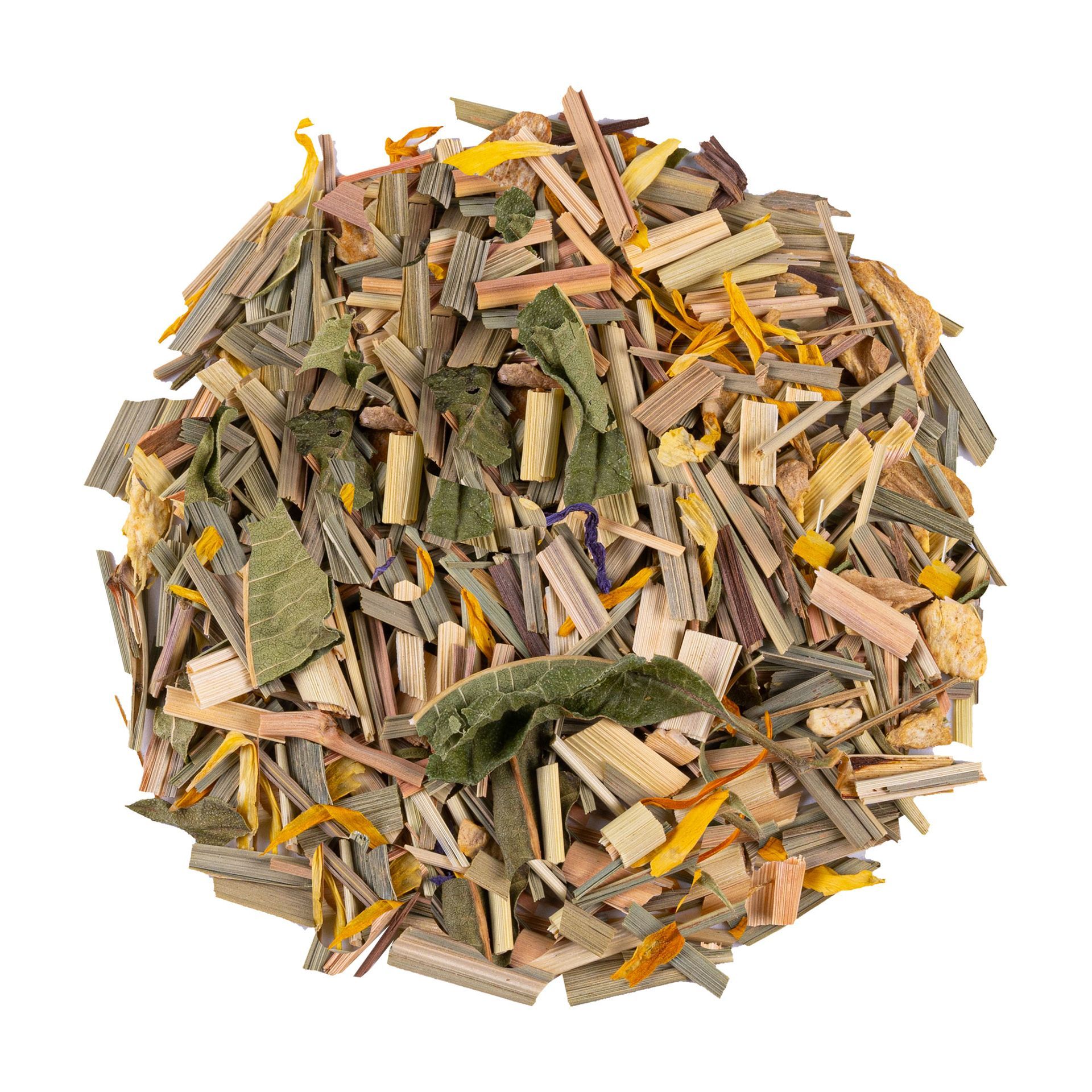 Ingrediënten: Citroengras*, gember* (21%), verbenakruid (hele bladeren)*, goudsbloemblaadjes*, kaasjeskruidbloesem*.