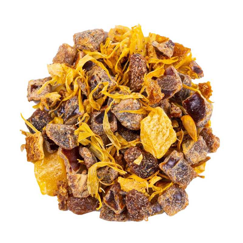 Ingrediënten: Dadels (dadels, rijstmeel), ananas (ananas, suiker), druiven (druiven, plantaardige olie), sinaasappelschil, citroenschil, natuurlijk aroma, sinaasappelschijfjes, mandarijnschil, natuurlijk sinaasappelaroma, goudsbloemblaadjes.